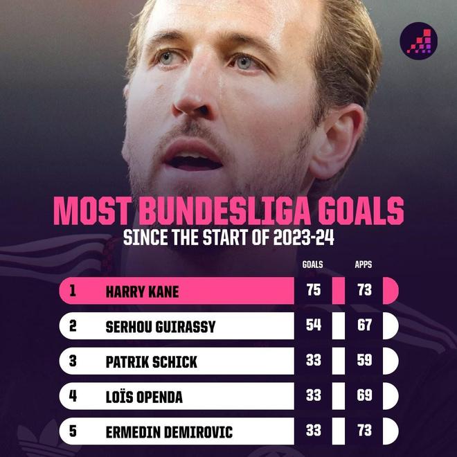 本賽季德甲第10輪,拜仁客場2-2戰平柏林聯合,凱恩在補時階段頭球絕平。這場比賽后,凱恩在73場德甲比賽中已打入75球。自2023/24賽季德甲首秀后,凱恩位列同期球員進球數第一。